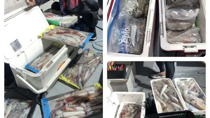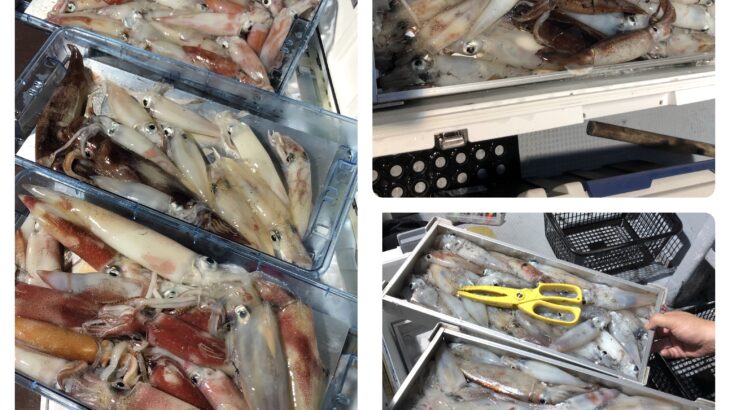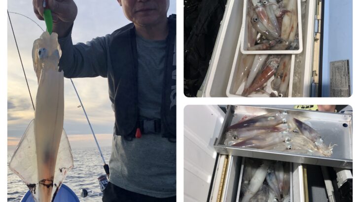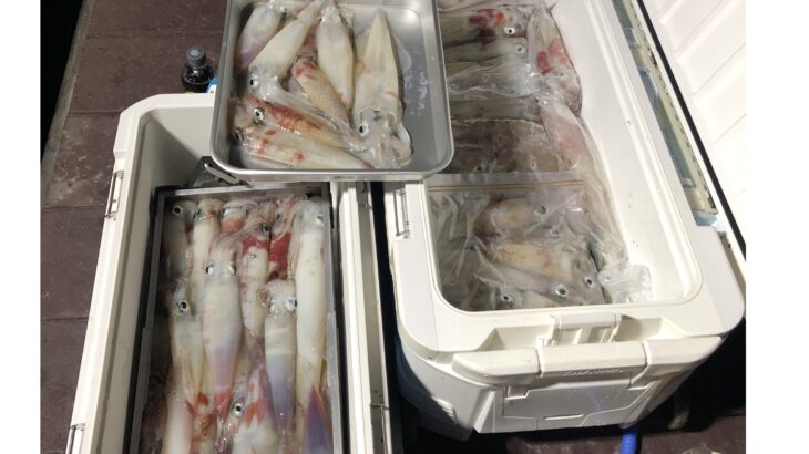 今日は少人数の出船でイカ釣りに行ってきました!明るいうちは数ハイ釣れる程度でしたが、20時頃からよく釣れだしました。数を釣る方は底まで落とさず浮いてきたイカを効率よく釣られてました。白イカ120〜65ハイ。船中500ハイくらいでした。
