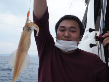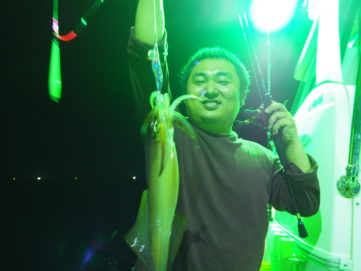 8月8日(土)今日は、予報よりも海上予報がよく明るいうちから良く釣れたで期待しましたが、火を入れてから暫く沈黙が続きラッシュなく終了しました💦 0〜43杯 船長も船酔い者のお土産確保の為、参戦して船中250杯