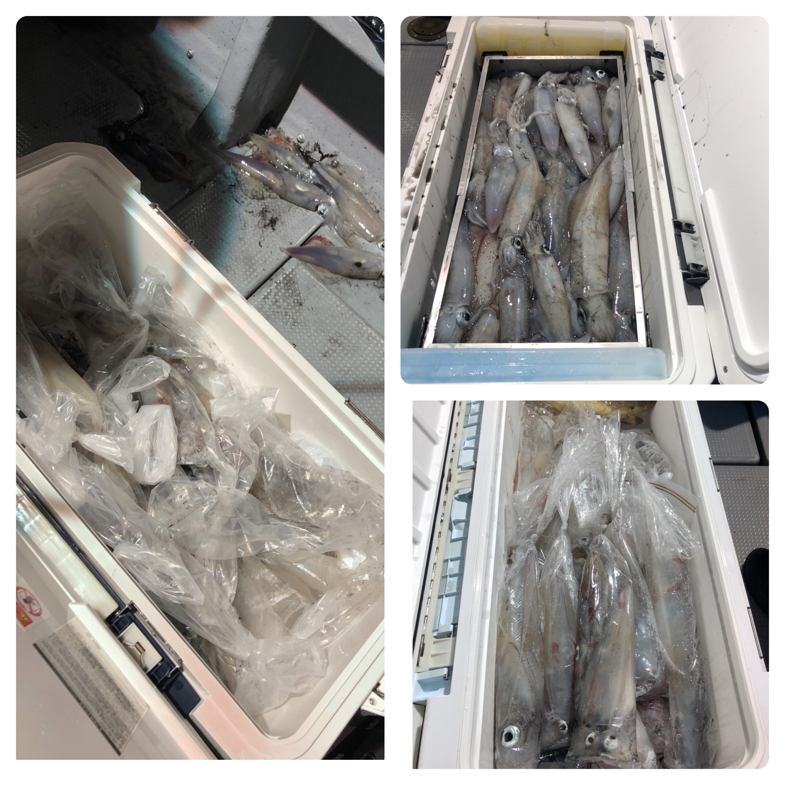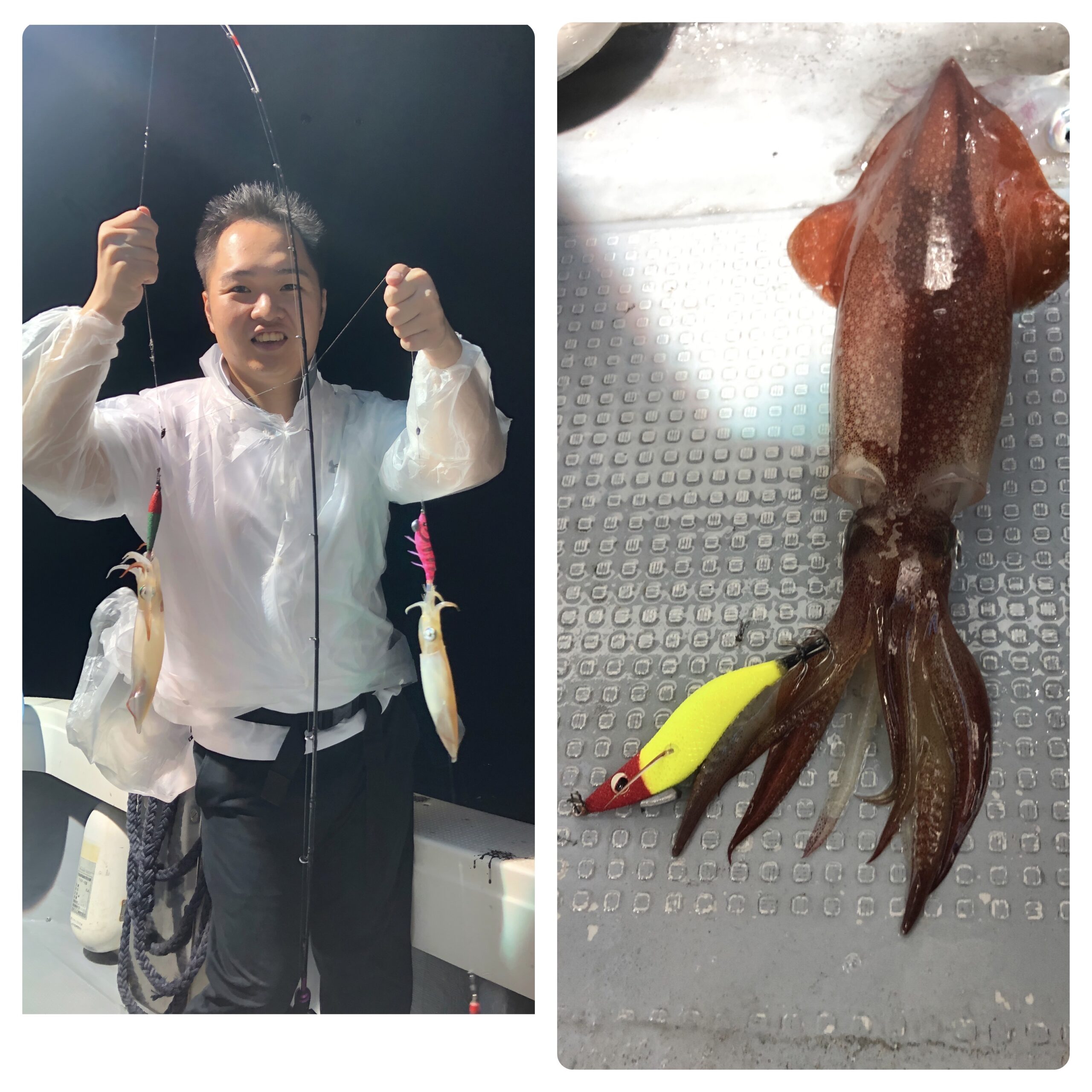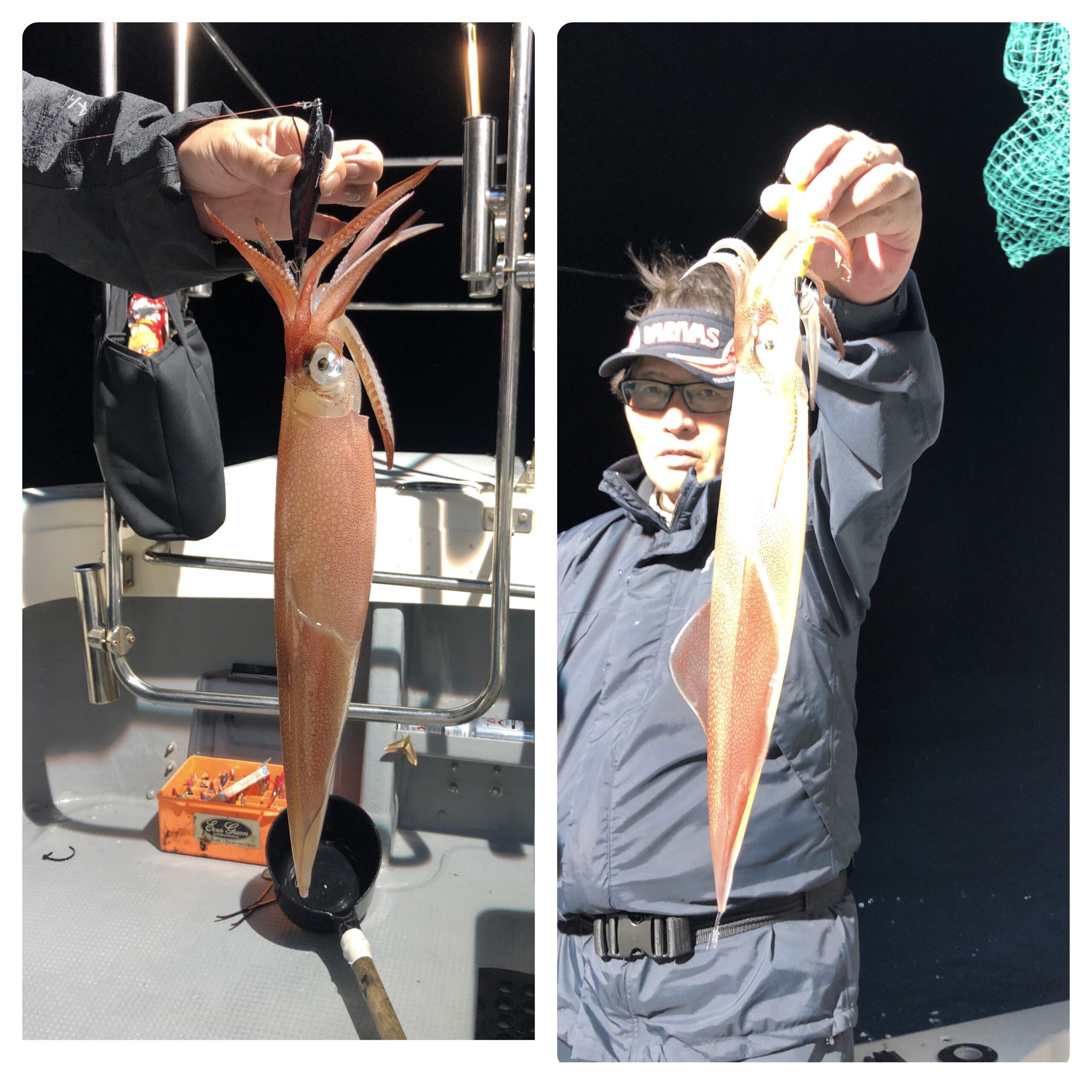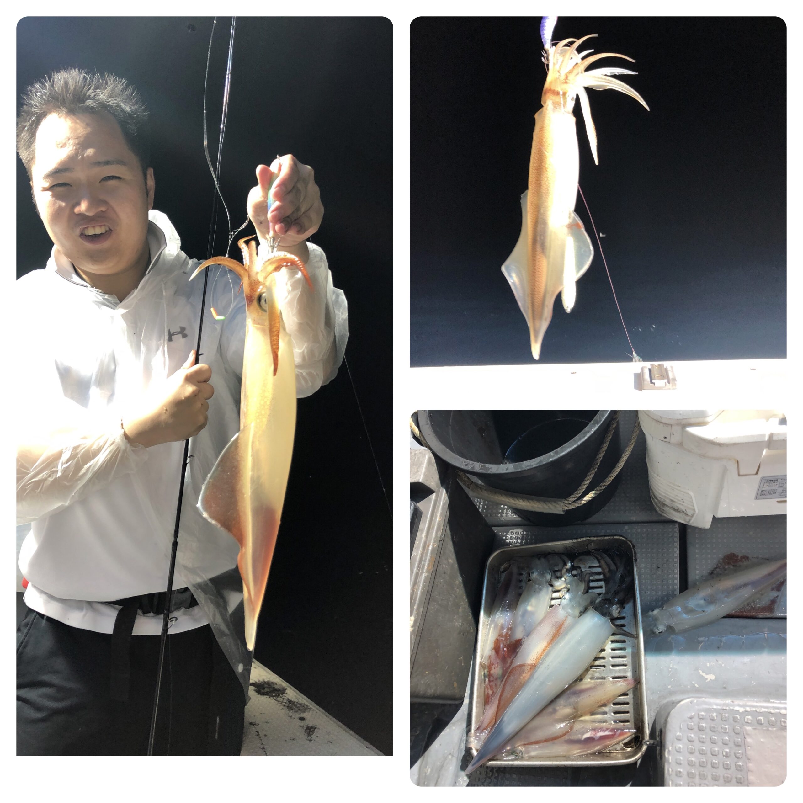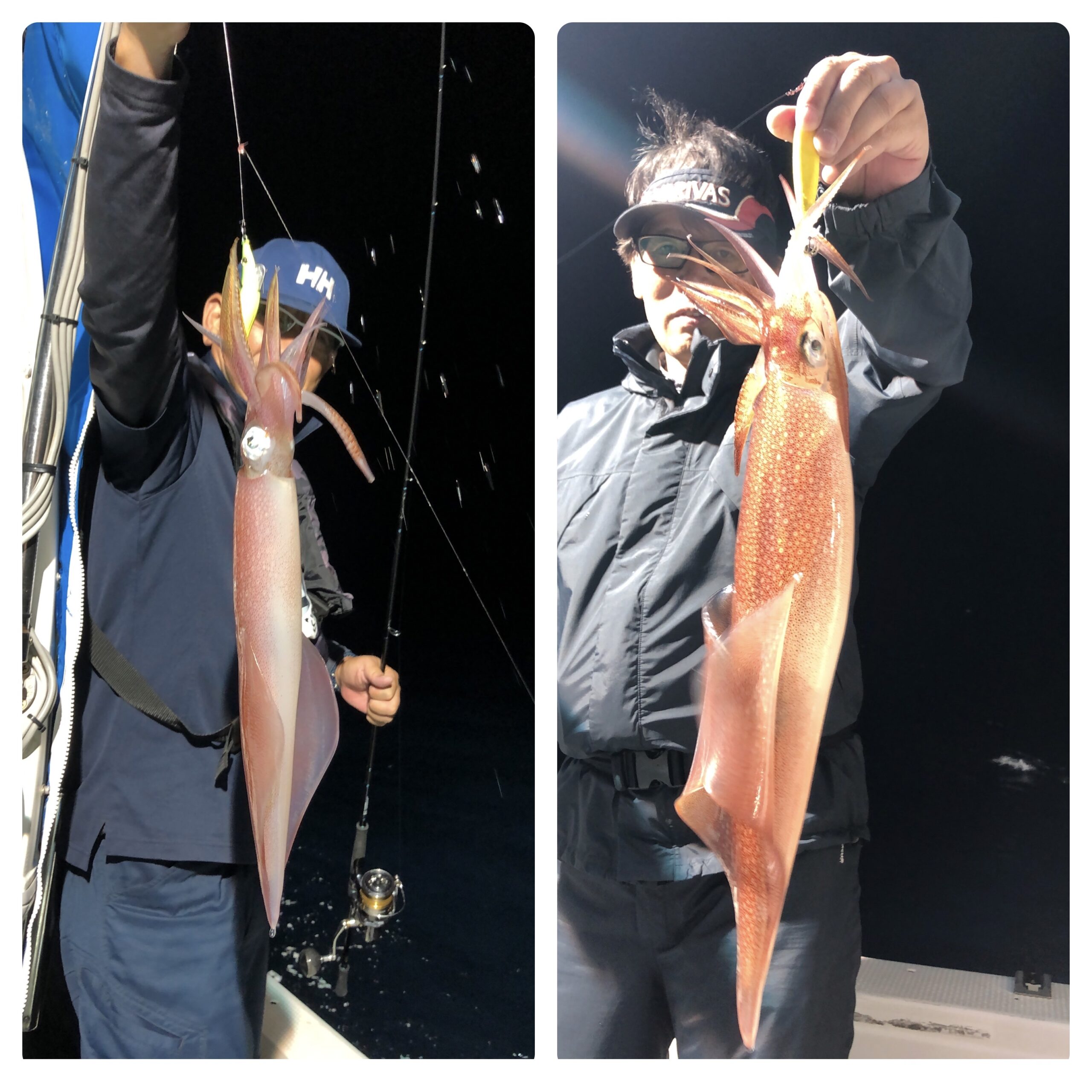 シケ続きでしたが、深夜前には風も弱くなる予報でしたので、少し遅め出船で6名様でイカ釣りに行ってきました!シケ後なので、なかなかイカ溜りを見つけられず3回も移動し何とか三度目の正直で型もよい群れにアタリそれなりに楽しんで頂けたようでホッとしました。白イカ38〜10杯、船中170杯くらいスルメ多数でした。