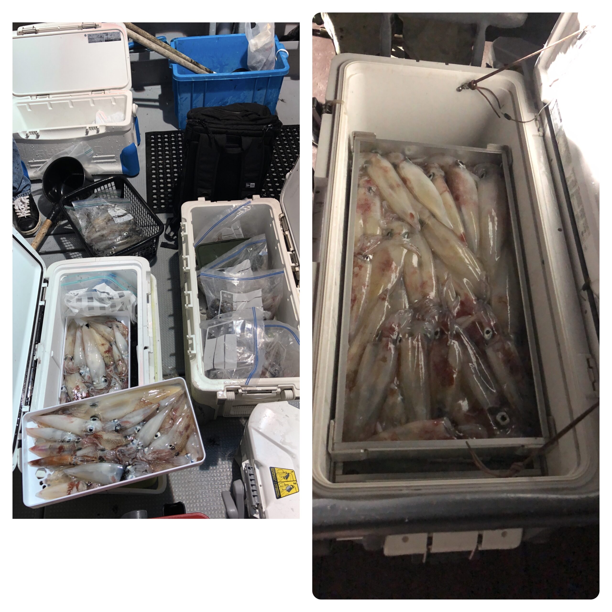 快晴ベタ凪の中、イカ釣りに行ってきました!明るいうちかポロポロ釣れ、集魚灯点灯後からもポロポロでずっっとポロポロでしが、そのなかでも調子良く数を伸ばされる方が多数いました。白イカ70〜38ハイ。船中550ハイくらいでした!