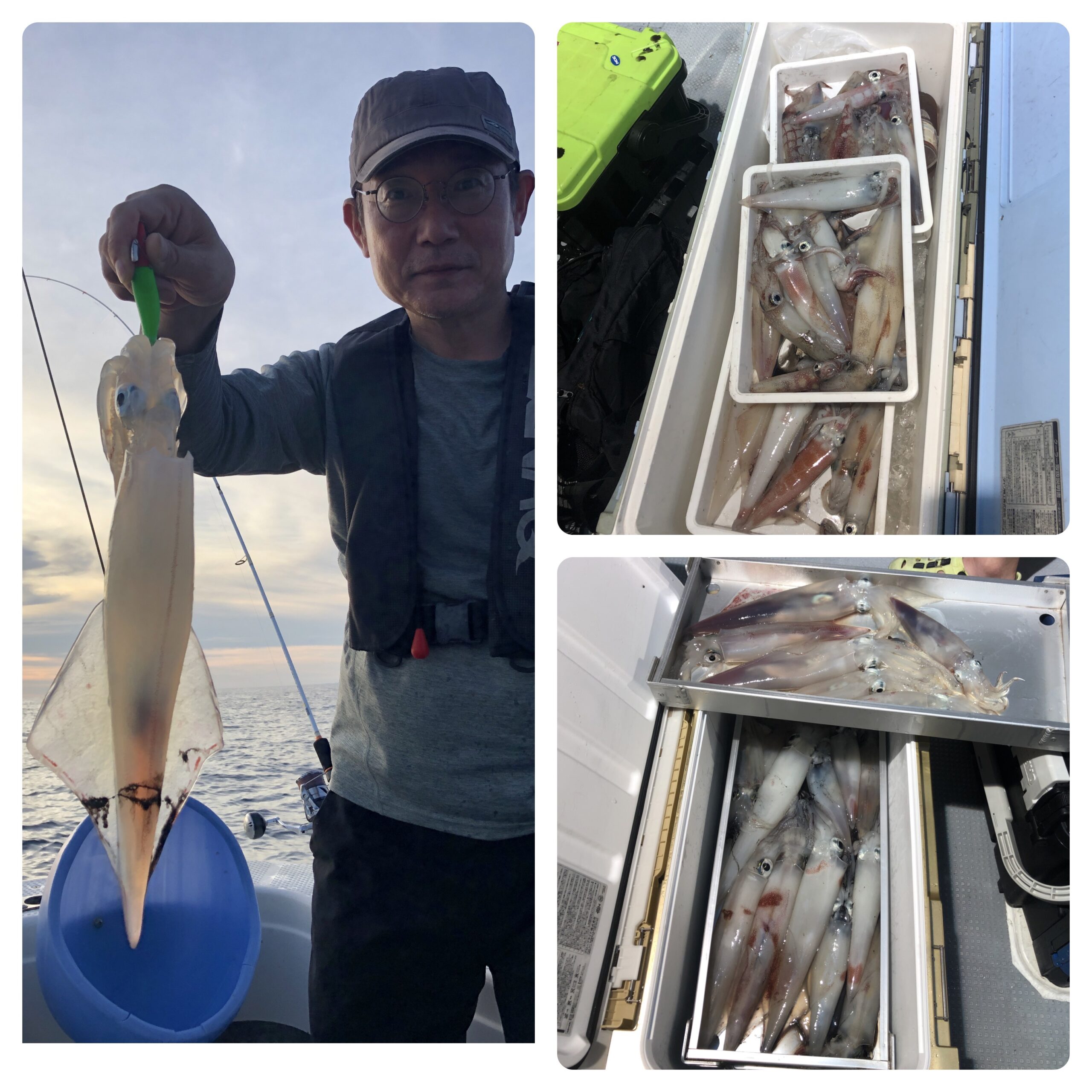 快晴ベタ凪の中、イカ釣りに行きました!今日も、かなりの激流、、、汗。明るいうちに20ハイくらい釣れてました。20時頃からアタリも多くなりポロポロ釣れだしますが、激流のため手返し悪く思うように数を伸ばせませんでした。白イカ40〜20ハイ。船中250ハイくらいでした。