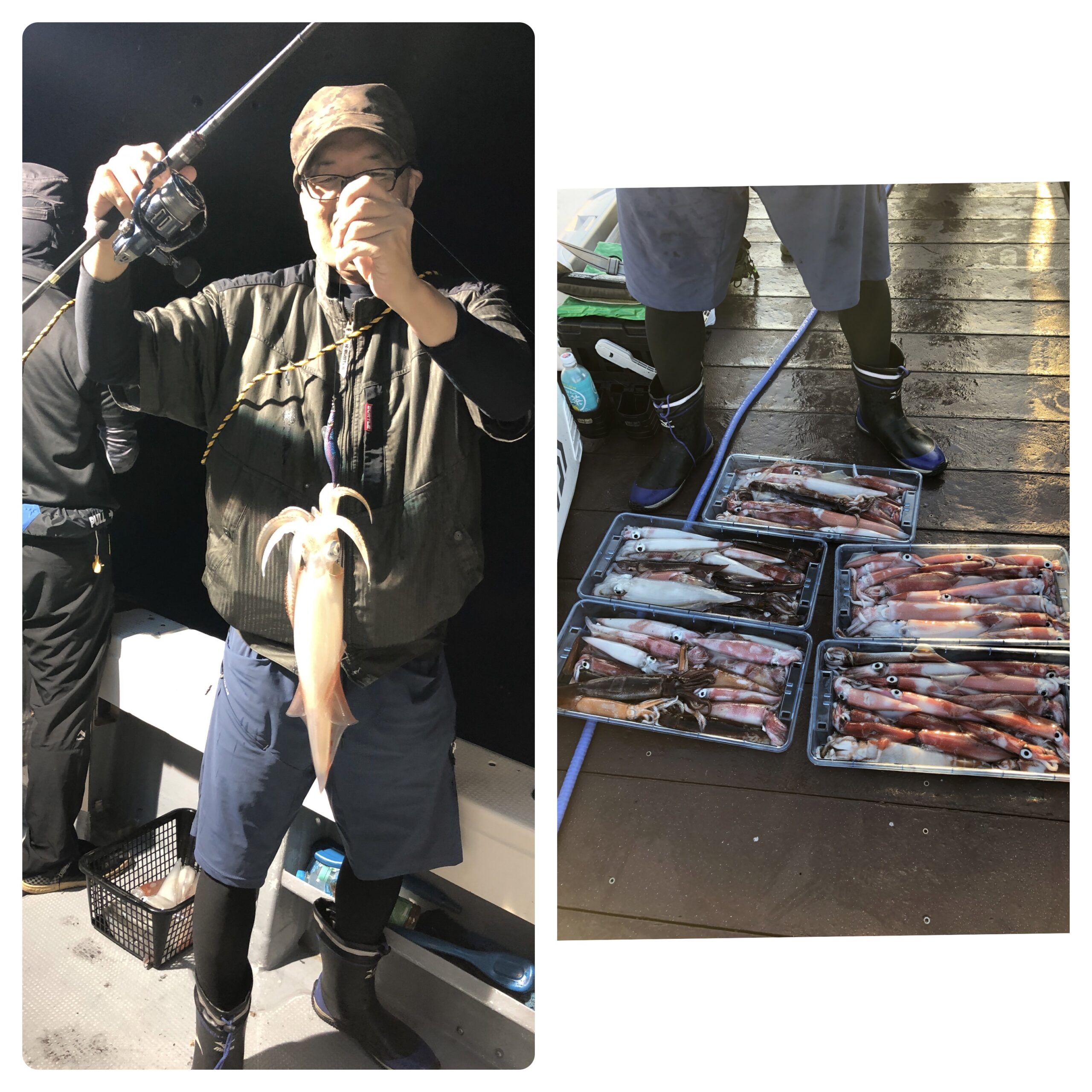 出航する頃には風波もおさまり快適にポイントまで行けました。集魚灯点灯後直後からよく釣れ出しました!午前3時頃に少し息切れしましたが、終日ヒマしない程度に釣れてました。白イカ75〜45ハイ。船中650ハイくらい。今日はスルメも珍しく釣れました。