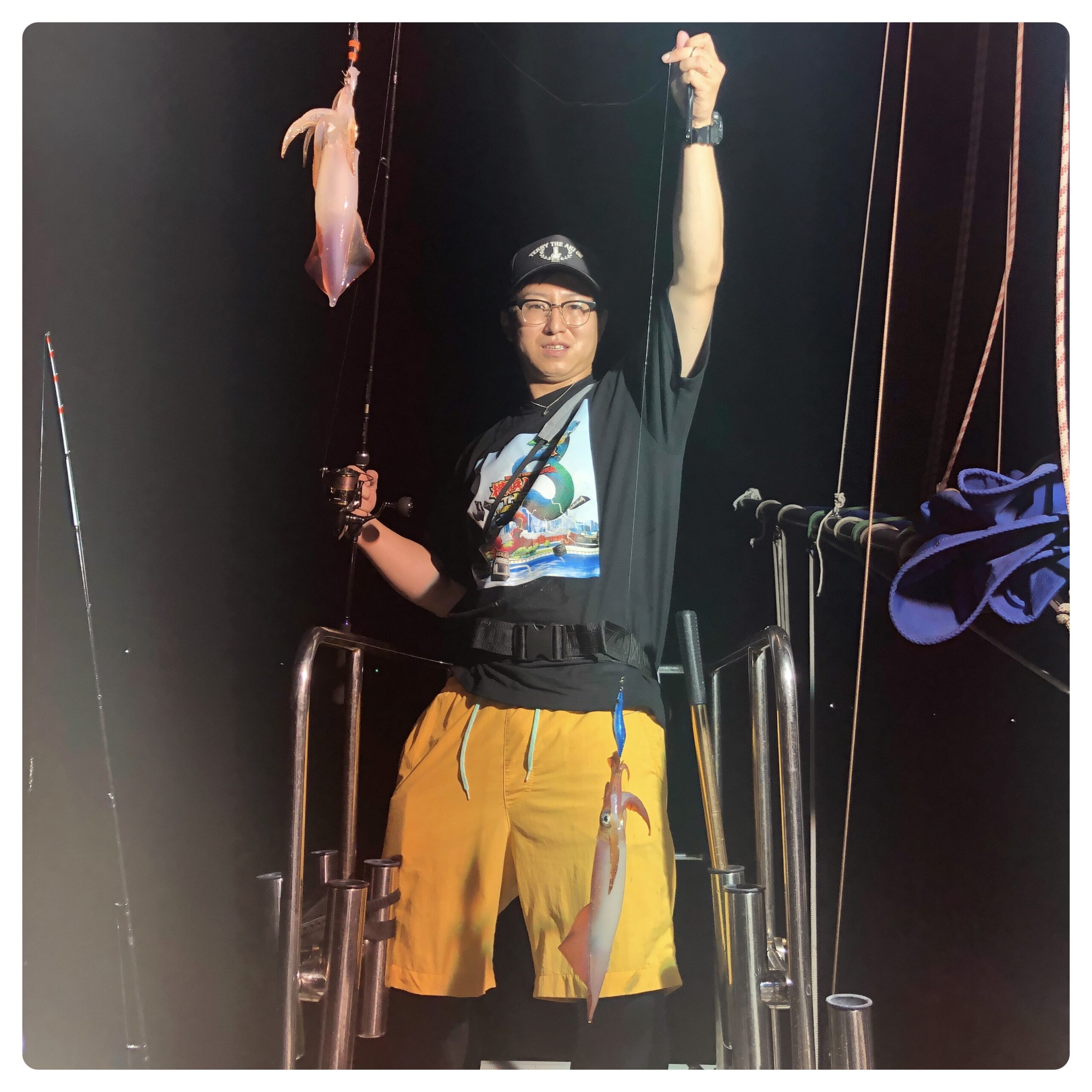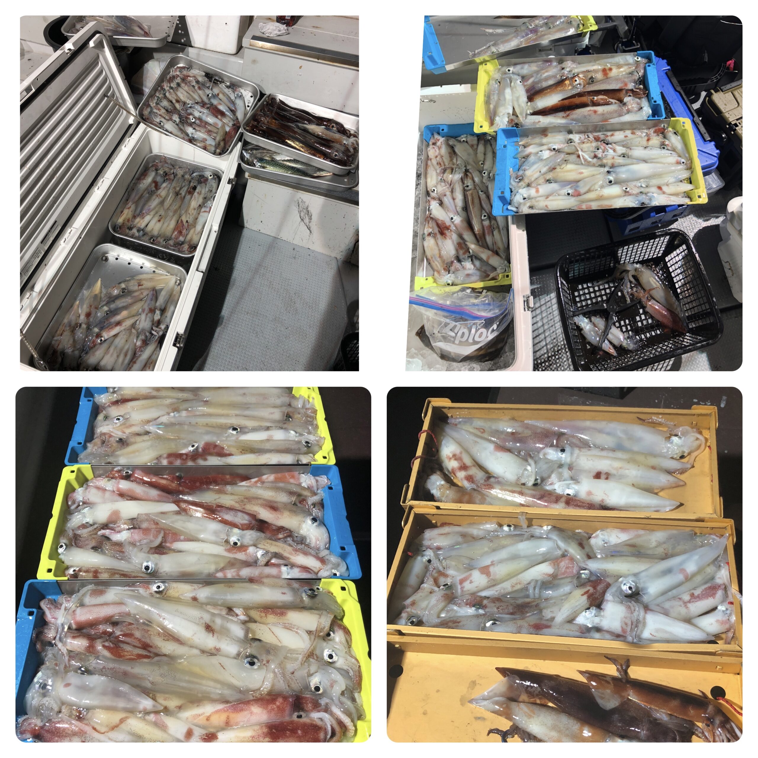 ベタ凪の中、イカ釣りに行ってきました!明るいうちはあまり釣れず、ライト点灯後の20時頃からよく釣れだしました。途中、一時的なペースダウンがありましたが、終了時刻まで釣れ続けてました。白イカ100〜45ハイ。船中650ハイ位、スルメ多数でした。