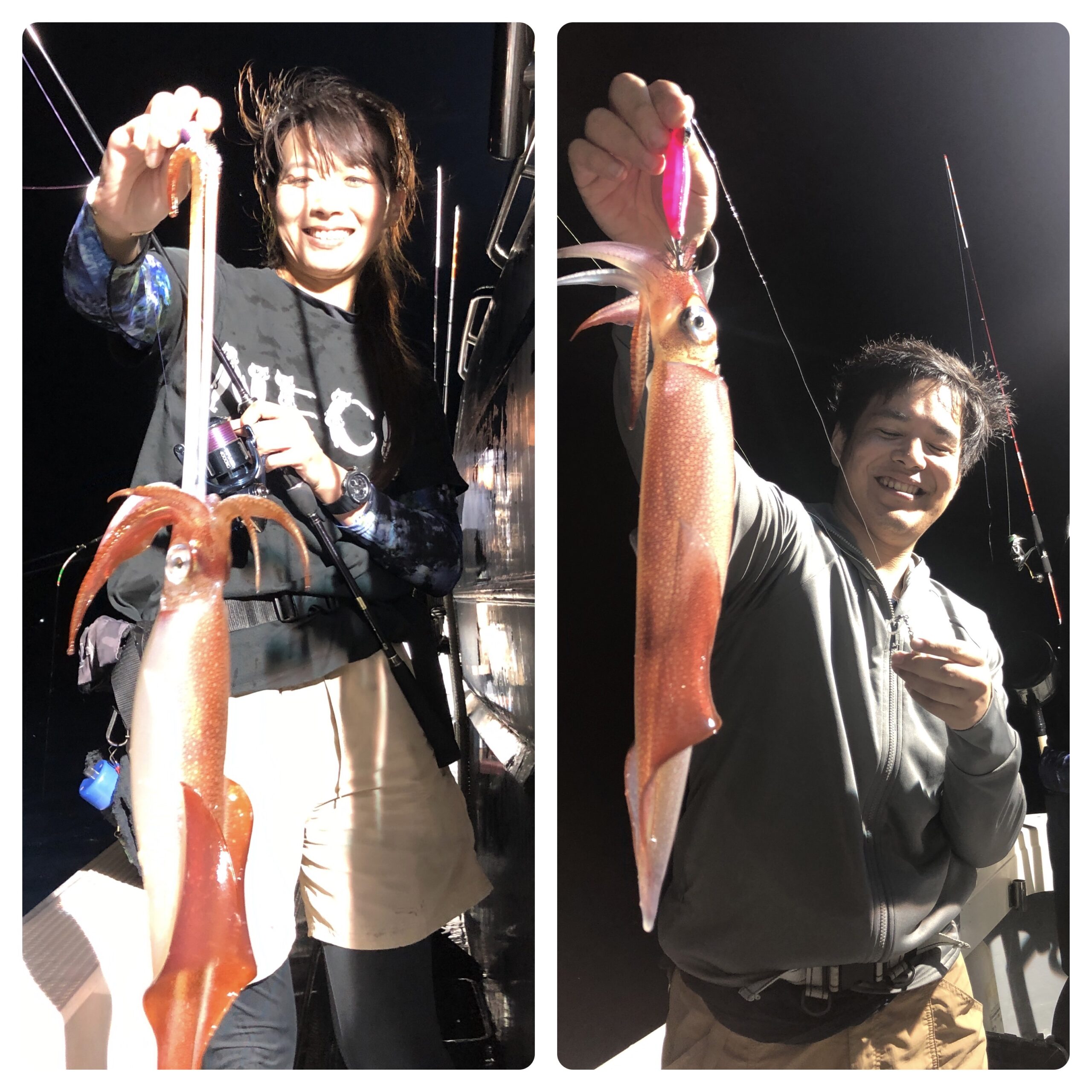 ベタ凪の中、イカ釣りに行ってきました!ポイント決め直後から釣れ出したので、期待しましたが終日ずっっっとポロポロ釣れる程度で入れノリはありませんでした。白イカ39〜20ハイ、船中320ハイ位。スルメ多数でした。