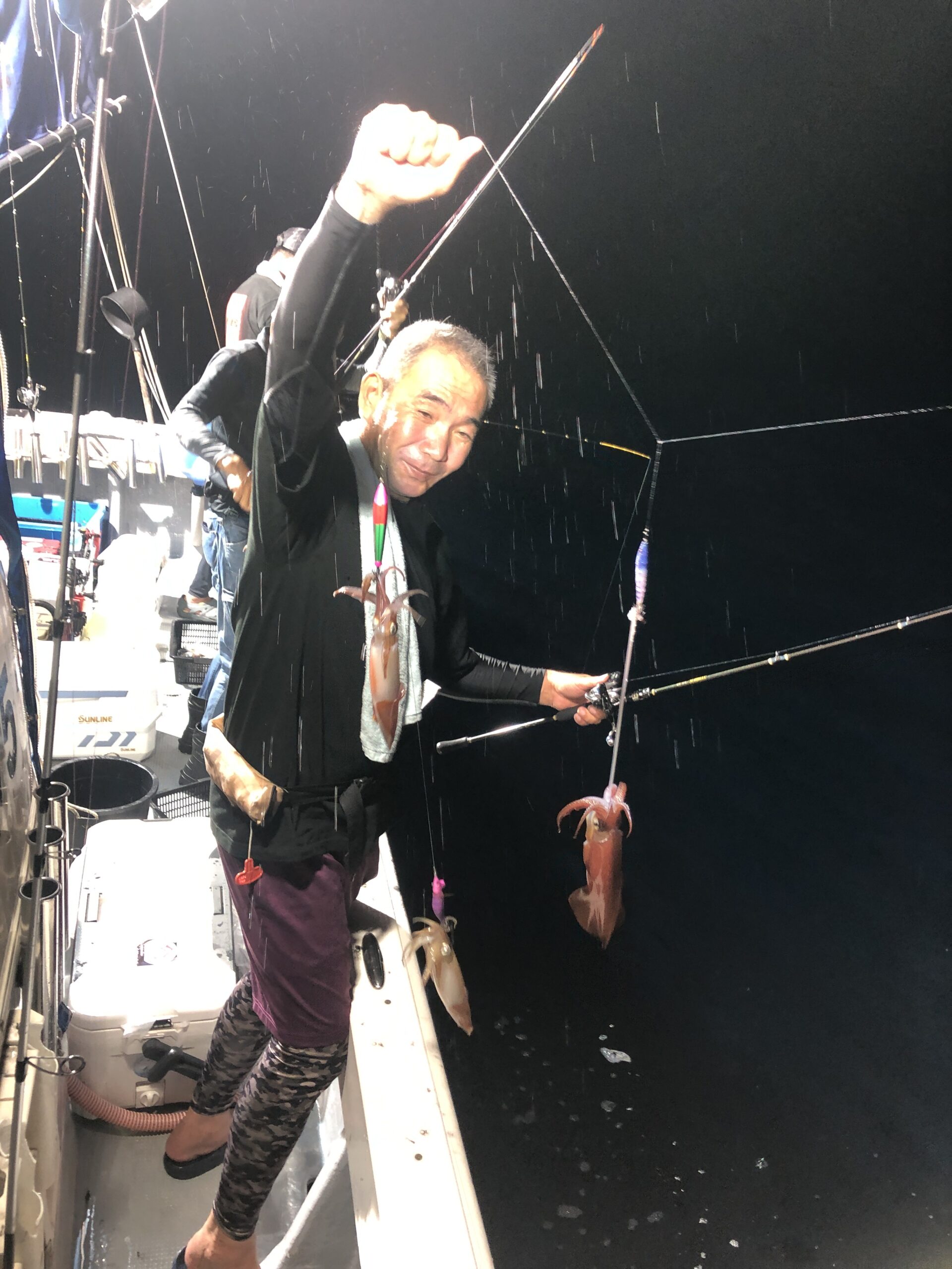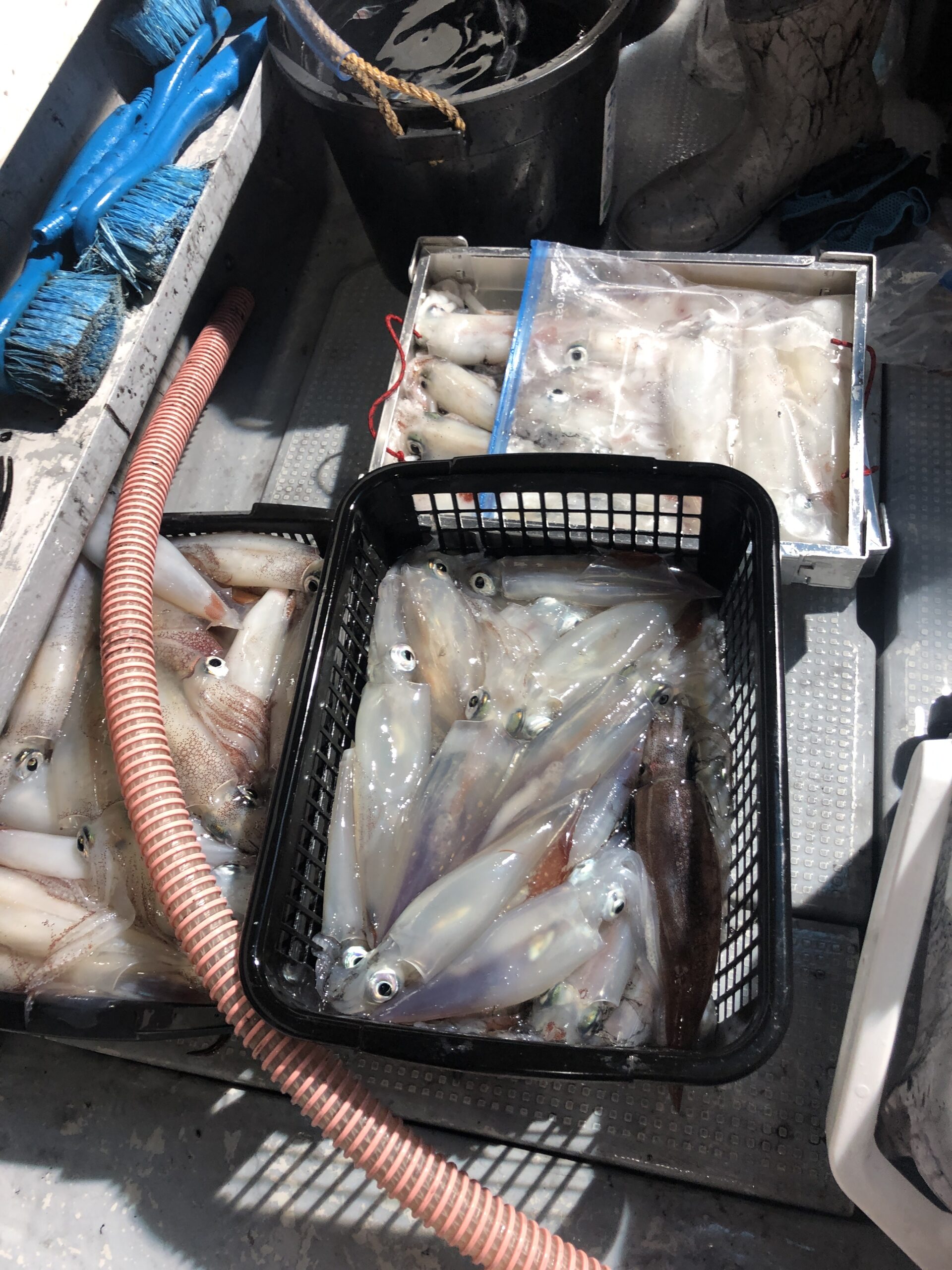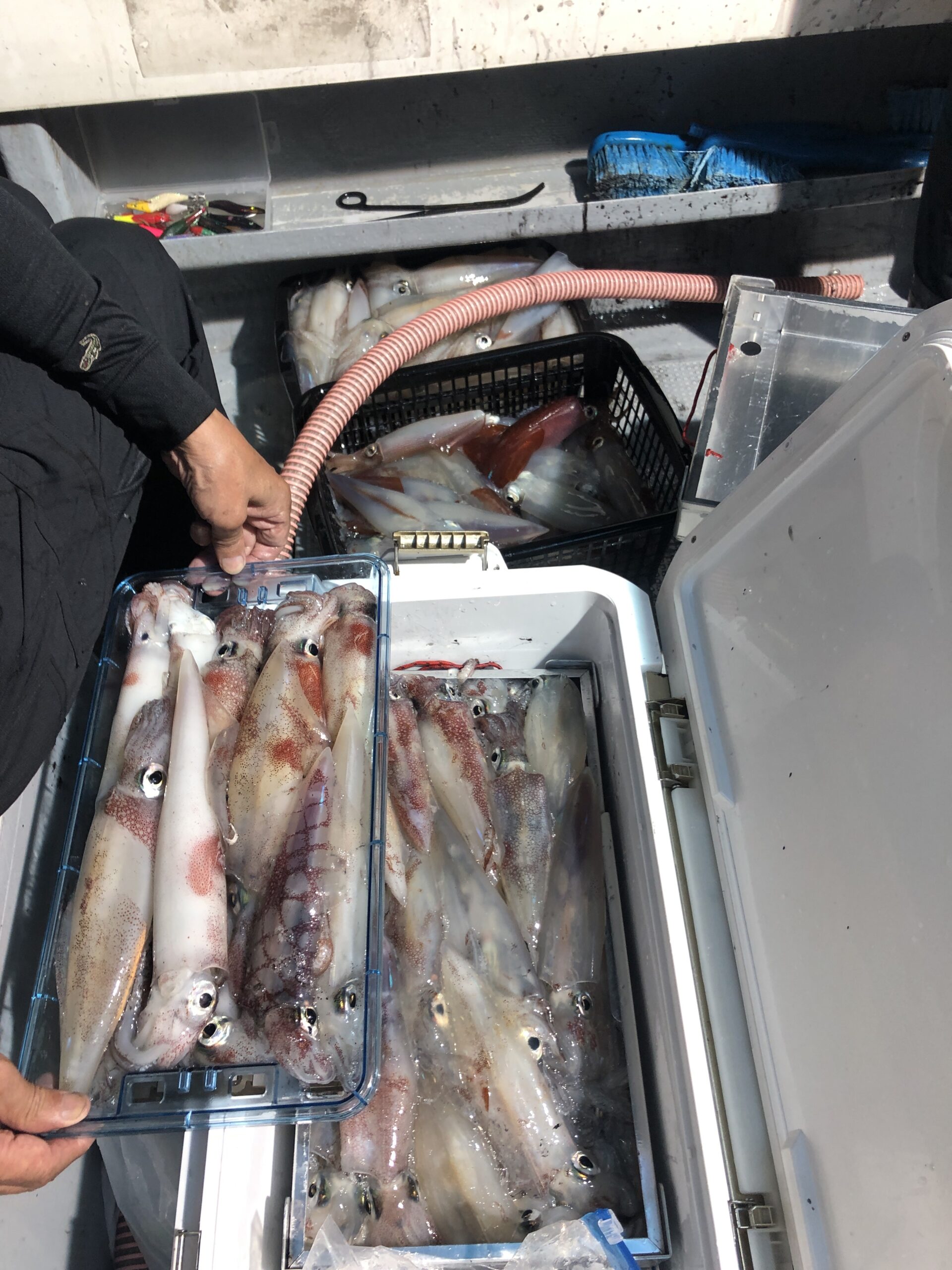 毎年恒例となってる、釣具の『オーシャン』様のイカ釣り大会に参加艇として出船しました。大会の勝敗は、釣った白イカ7杯の重量で決まります。当船は最下位でした、、、笑。短時間でしたが皆さんよく釣れてました。TOP126、114〜65杯、船中は1,000杯越えでした。