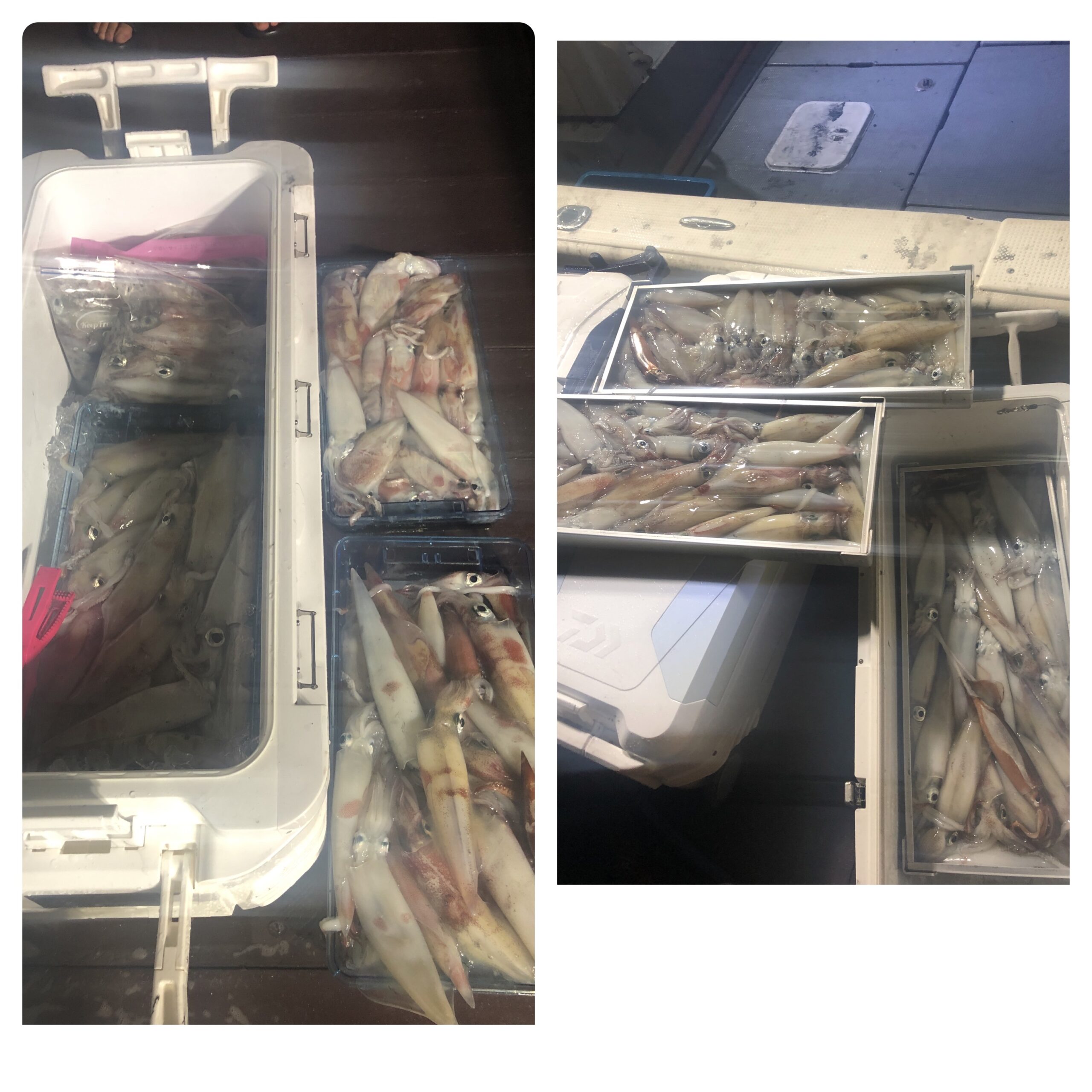 チャーターでイカ釣りに行ってきました!月夜の影響でたくさん釣れるか心配でしたが、到着直後から終了時刻までずっっっとペースよく釣れました。イカの浮が悪かったので200杯にはとどきませんでしたが、全員100杯オーバー、船中1,000杯以上は釣れました。